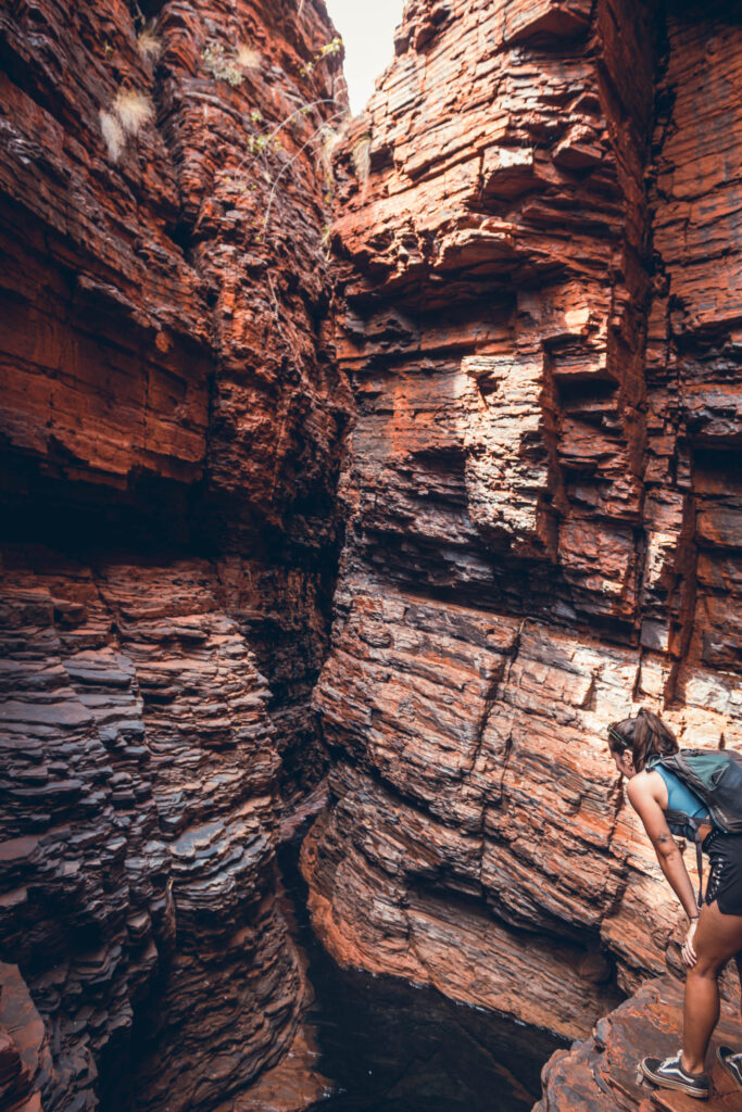 Hamersley est la piscine naturelle la plus célèbre de Karijini. Pour s’y rendre, il suffit de descendre quelques escaliers puis d’escalader des rochers. En fin de journée (vers 17h), vous l’aurez pour vous tout seul. J’avoue que le bassin reculé, niché dans la roche, est incroyable avec cette petite cascade. Nous, on a particulièrement aimé les couches de roches qui se superposent, formant une sorte de vague géante.