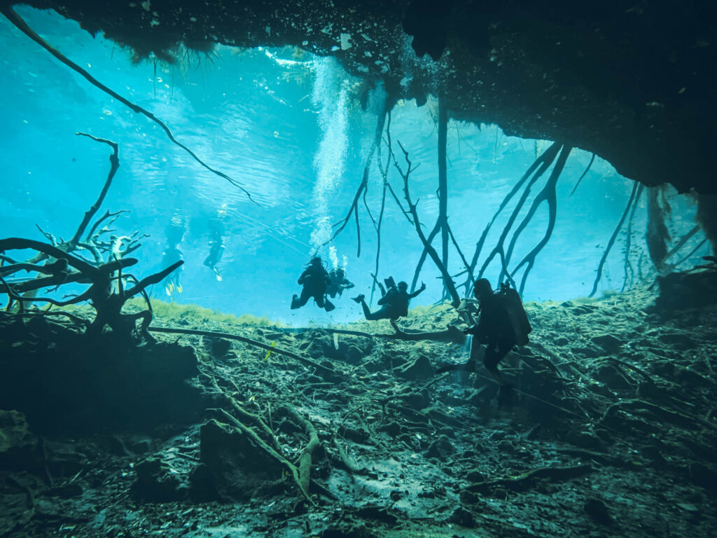 Ici, pas grand chose d’exceptionnel à observer mais plonger dans ces grottes souterraines a un côté un peu mystique. Nous avons choisi Dos Ojos car elle détient l’une des meilleures visibilités de toute la région du Yucatán. On peut y observer des formations de stalactites, stalagmites ainsi que la Bat Cave. À un moment de la plongée, on remonte à la surface pour se retrouver dans une grotte où le plafond est tapissé de chauve-souris. Comptez 180€ pour deux plongées.